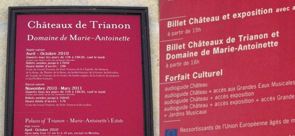 Quelques années plus tard, preuve de l’absurdité d’une appellation qui ne signifie pas grand chose pour un lieu chargé de plus de deux cents ans d’histoire, (de Louis XIV à l’impératrice Eugénie en passant par Louis XV et Marie-Antoinette), au même endroit, le panneau indique à nouveau la présence du Petit Trianon. De la même façon, sur les dépliants d’orientation, le « Domaine de Marie-Antoinette » se voit associé à nouveau aux « Châteaux de Trianon », quand, à l’entrée du Grand Trianon ou sur les panneaux aux caisses du Château, l’appellation « Châteaux de Trianon » supplantent même celui de « Domaine de Marie-Antoinette ». Comme quoi.