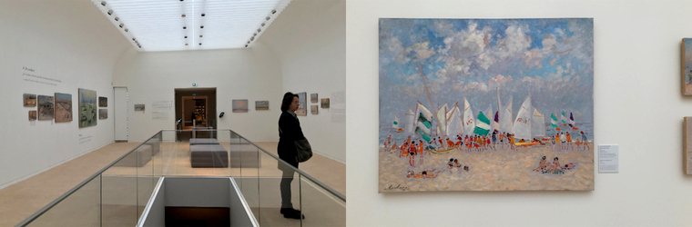 Plus loin, on trouve un portrait par Kisling de la chanteuse Suzy Solidor qui débuta sa carrière dans les années 1930 à Deauville, accompagné de CD et de livres [5]. Là, des scènes campagnardes s’accompagnent d’ouvrages sur la Normandie d’autrefois. L’Univers Cheval, qui dispose d’un fonds documentaire de référence reconnu par la BnF, expose tableaux de courses, figurines et autres artefacts… Ainsi dans toute la médiathèque. La cohabitation fonctionne très bien. Les œuvres ne sont pas écrasées par les livres. Le confort visuel est soigné, le public déambule dans un environnement calme. On sent que tout a été savamment pensé, ce ne sont pas juste des tableaux accrochés ça et là. En plus de ses comités de réflexion, la ville s’est faite accompagnée, pour l’élaboration du projet global, par une société spécialisée, AP’Culture. Pourquoi le concept de fusion médiathèque-musée n’a pas été poussé jusqu’à intégrer une artothèque pour le prêt d’oeuvres ? On nous répond que le fonds ne s’y prête pas et que ce serait concurrencer une artothèque qui existe déjà depuis 20 ans avec succès, non loin de là, aux Dominicaines de Pont-l’Evêque.