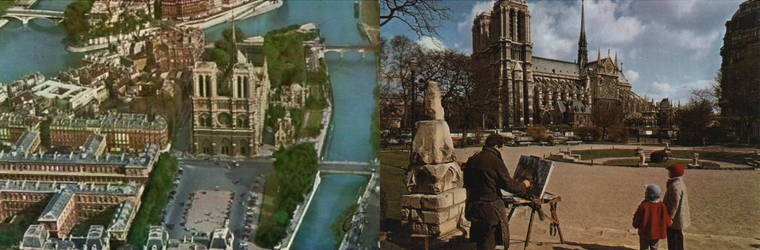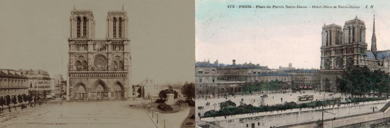 Piéton·nes sur le parvis Notre-Dame, détails de cartes postales anciennes