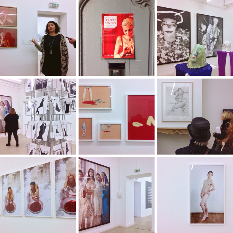 On retiendra, de manière totalement subjective, les triangles de mots de Ninar Esber reproduisant des phrases entendues, interdictions faites aux femmes de par le monde ; les autoportraits chauves de Carolle Bénitah qui défie ainsi son cancer (photo de l’affiche) ; les cartes postales illustrant avec humour des femmes en burqa que Leila Gadhi a dessinées, lassée qu’on lui demande, parce que d’origine franco-marocaine ce qu’elle en pensait ; les dessins rougeoyants de Hanan Ourraht qui ont pour thème, suprême tabou, les règles féminines ; enfin Damien Rouxel, jeune gay breton, se jouant des codes féminin et masculin, qui se met en scène en reine de beauté. Qu’est-ce qu’être femme ?
