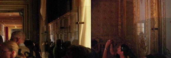En réalité, il n’est aucunement question ici de respect naturel qui expliquerait l’absence d’ultra-protections pour les oeuvres anciennes mais juste question d’argent. Les musées nationaux n’assurent pas leurs oeuvres. Devant la quantité de trésors qu’ils possèdent ils n’en auraient pas les moyens. Et quand il y a dégradation, ils en assument la charge [4]. En revanche, dès qu’une oeuvre sort des collections pour rejoindre une exposition à l’extérieur, elle est assurée et le musée peut exiger alors un dispositif particulier. C’est le cas à Versailles même, dans la nouvelle présentation du Grand Couvert de la Reine récemment restauré, qui a été remeublé avec goût pour évoquer le souper public du roi. Le musée du Louvre a prêté des éléments de la vaisselle en argent de Georges III d’Angleterre réalisée sur le modèle de celle de Louis XVI. Posés sur la table recouverte d’une belle nappe blanche, la scène est du meilleur effet telle qu’elle est présentée sur le blog de Jean-Jacques Aillagon. Publicité quelque peu mensongère puisqu’en réalité, les visiteurs découvrent in situ une énorme cloche de verre venant coiffer la table, ce qui gâche quelque peu la vision et annule l’illusion historique. N’aurait-il pas mieux valu disposer sur la table de la vaisselle plus commune ?