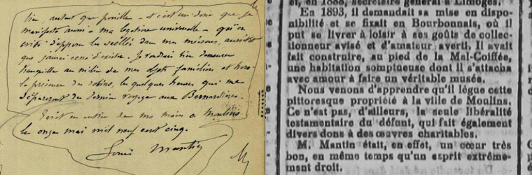 [1] Le testament de Louis Mantin, ainsi que l’inventaire après-décès de ses biens, est consultable sur le site des Archives départementales de l’Allier : https://archives.allier.fr/archives-et-histoire/testaments-illustres-et-anonymes.