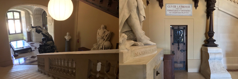 Au rez-de-chaussée, outre deux statues de chasseurs à demi-nus censées représenter la domination de l’Homme (l’homme) sur l’animal et la nature, on découvre avec stupeur les caveaux de Guy de la Brosse (1586-1641), fondateur du Jardin des Plantes, et de Victor Jacquemont (1801-1832), « voyageur » du Muséum mort très jeune, des plaques, celle en hommage à Louis Jules André, architecte « de cet édifice » et une autre, étonnante, des deux auteurs de la rénovation de 1987-1994, Paul Chemetov et Borja Huidobro, ornée de la phrase suivante, sorte d’oxymore patrimonial : « Conserver c’est transformer ».